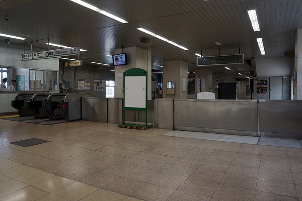 構内から見た終端部分。三田線は8両編成対応で作られていますが、実際は6両です。電車が入らない2両分にはドア無しのホーム柵(所々に非常ドアがある)が設置されています。ホーム側から見ると通常のホームドアと同仕様に見えますが、裏から見るとかなりの安普請です。