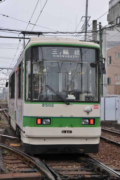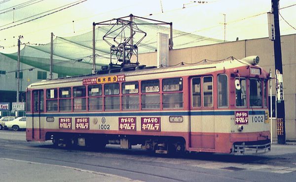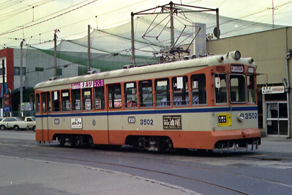 岡山電気軌道3500形3502。元は1959年東洋工機製の大分交通500形507で、1972年には岡電に譲渡されています。総括制御可能という、単行の岡電には無意味な機能を搭載しています。さらに「前乗り中降り」というドア配置も災いしたのか、あまり運行されない車両でした(岡電は主力の3000形の「前乗り後降り」が結果的に定着)。この3502は、後年7202に車体更新されて、現在も使用されています。