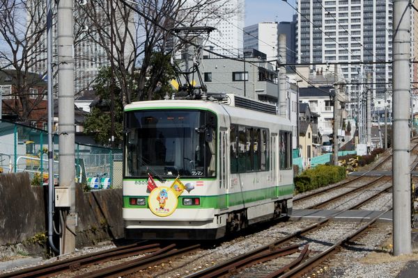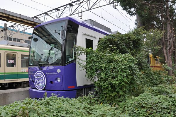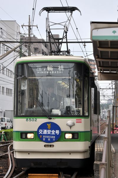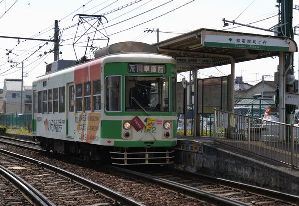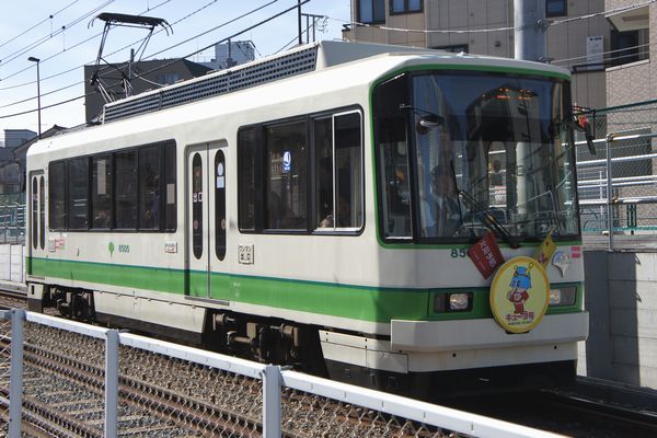 「都電バラ号」のヘッドマークを付けている都電9000形9001です。現在、沿線のバラが満開です。