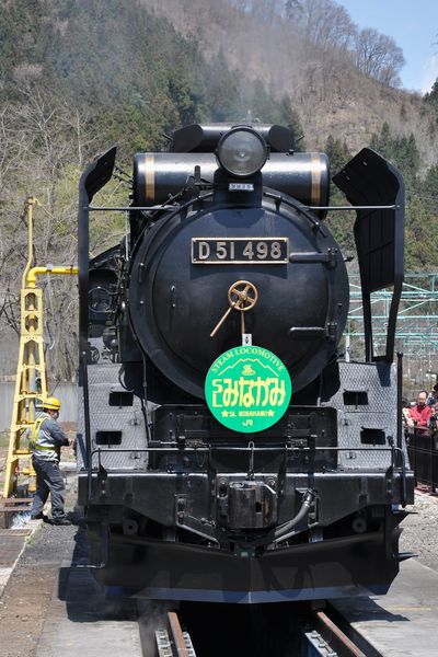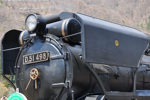 JR東日本の動態保存機D51 498号機です。今月末に予定されている中央東線での「SLやまなし」号に備えて集煙装置が装備され、デフレクターも大型の切取式(後藤工場式と言うらしい)に変更されました(同線が勾配区間であるためと、高さの低いトンネルが多いため)。変更前の姿はここ。