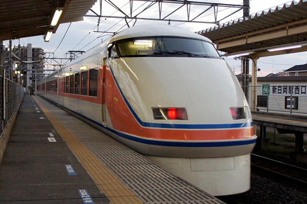 サニーコーラルオレンジ色の東武100系が、誰もいない新白岡駅を通過して行きました。