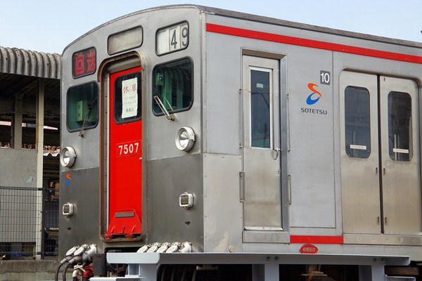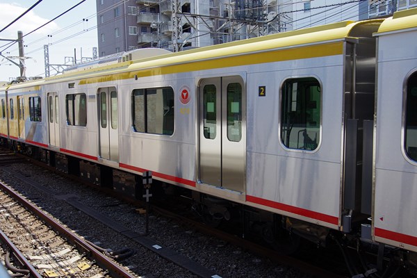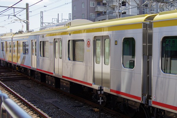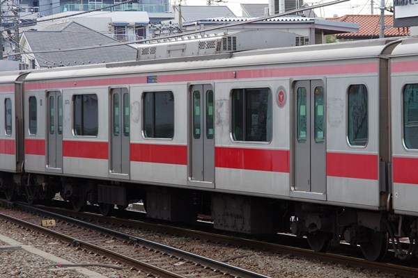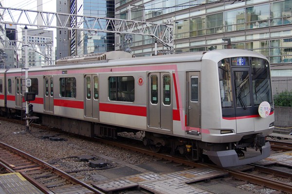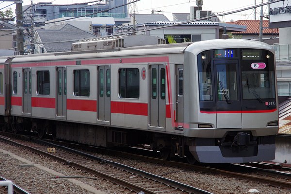 東急東横線の5050系の一部に見られるようになった「8CARS」編成です(画像は編成1号車クハ5173)。もともと東横線はすべて8両編成ですが、女性専用車と弱冷房車を副都心線にあわせた車両には、副都心線と色違いの8CARSシールが貼られているようです。ただし、1号車は直通開始後の3月18日からは女性専用車になりますが、まだ女性専用車ではないので女性専用車のシールは貼られていません。