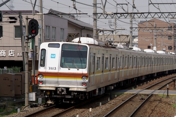 これは7030 です。乗降ドアの窓が大型になりました。比較的大きな番号の編成がこのタイプに変更されています。乗務員ドア下のテープも「赤」だけで副都心線専用となっています。
