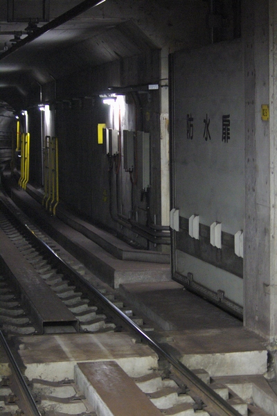 蔵前には以前蔵前国技館があり大相撲の興行が行われていました。現在の両国国技館は隅田川の対岸になります。大江戸線も蔵前の隣が両国ですから、当然隅田川の下をくぐることになります。それも関係があるのか、トンネルには大きな防水扉があります。