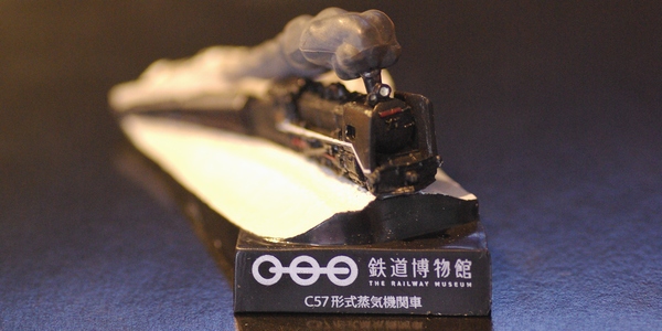 C57 135。雪景色の中、旧型客車を牽引しています。煙も再現されている意欲作(?)です。