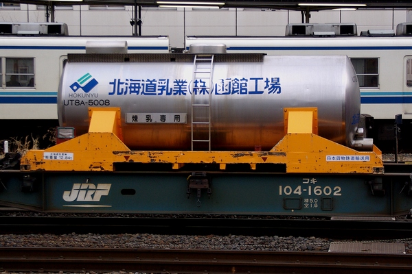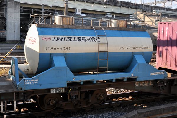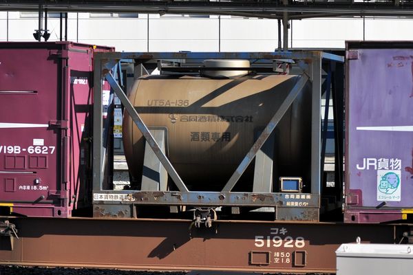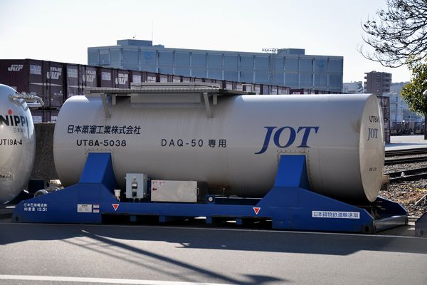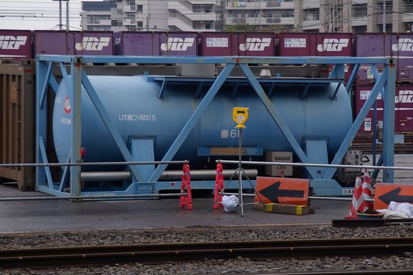 「~専用」という積み荷の明記がない怪しいタンクコンテナ。ただし、毒61の下にテープで目隠ししてあり、よく見ると「フェノール」という文字が透けて見えます。JFEケミカル株式会社所有。