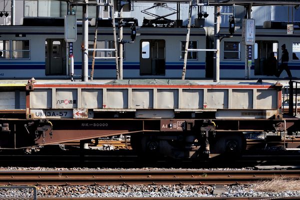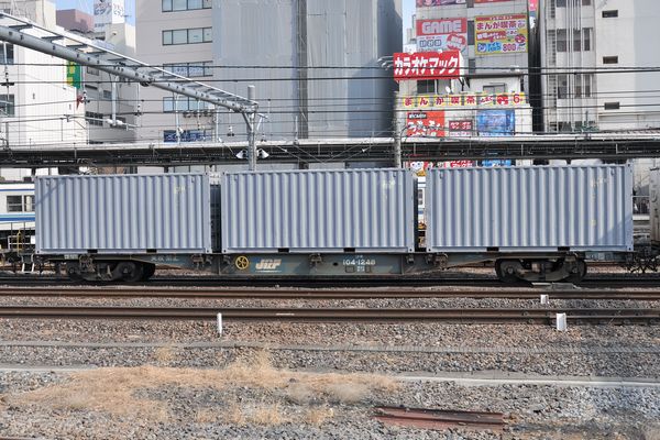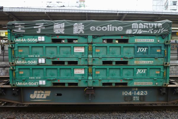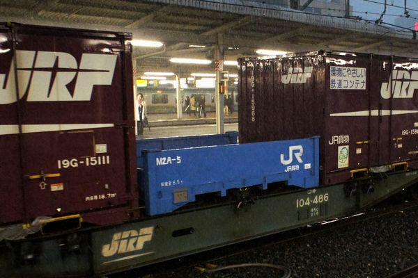 土砂降りの大宮駅を通過するコキ104-486に載せられた M2A-5 無蓋コンテナ。製造数16という、レアなコンテナです。仕事での移動中に遭遇しました。コンデジを買い換えたので、最悪のコンディションでも、まあ何とか番号は撮れました。