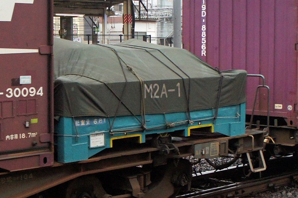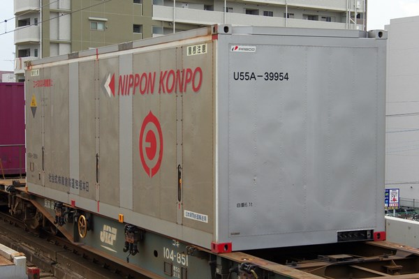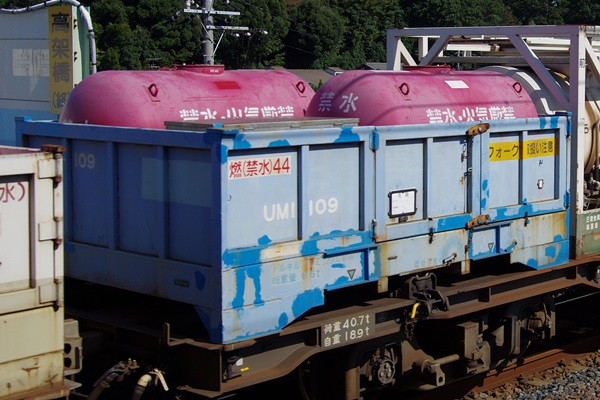 UM1-109無蓋コンテナです。アルキルアルミニウム容器(赤色のタンク)輸送専用です。