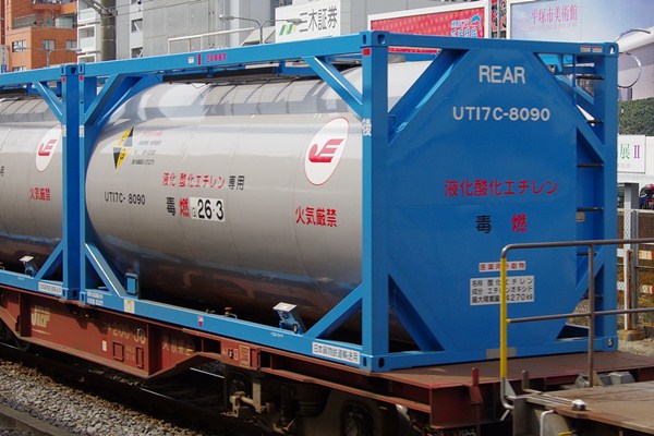 関西化成品輸送所有のUT17C-8090タンクコンテナです。液化酸化エチレン専用。酸化エチレンとはエチレンのパイ結合が切れたところに酸素が入って三員環になった恐ろしい分子です。分解爆発性、猛毒、発がん性あり。