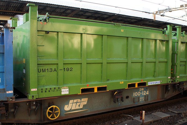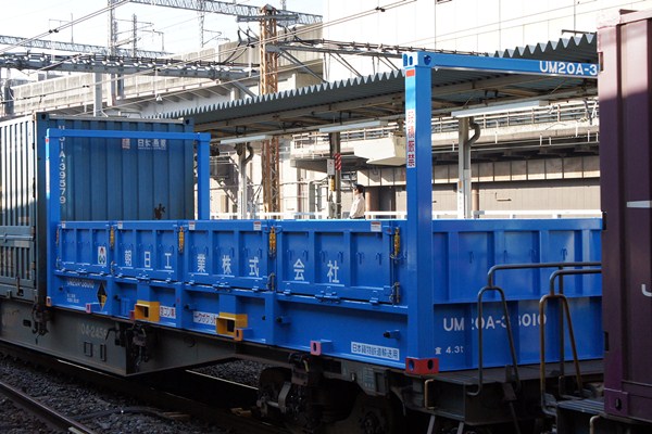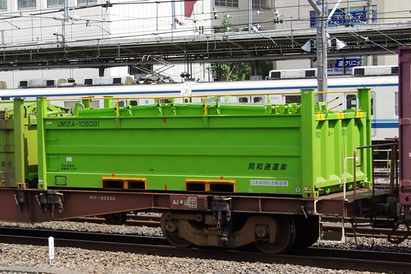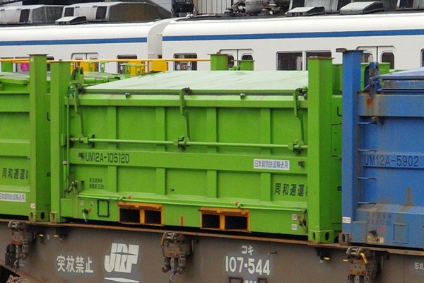 同和通運所有のUM12A無蓋コンテナです。この105092番は上蓋の開く方向が特殊なためか、黄色い手すりが付いています。