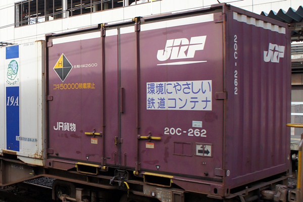 三方開きの20C-262コンテナです。全高が規格外で、鉢巻きを巻いています。20CはJRFマークが小さいです。