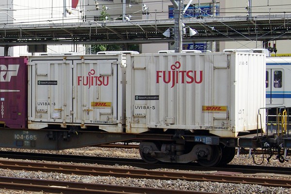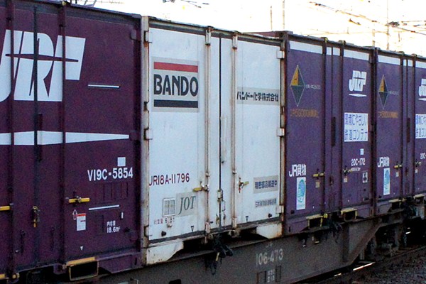 バンドー化学株式会社表記のUR18A-11796冷蔵コンテナです(所有はJOT)。「精密部品輸送中」という表示もあります。冷蔵コンテナであっても食品だけが積み荷とは限りません。
