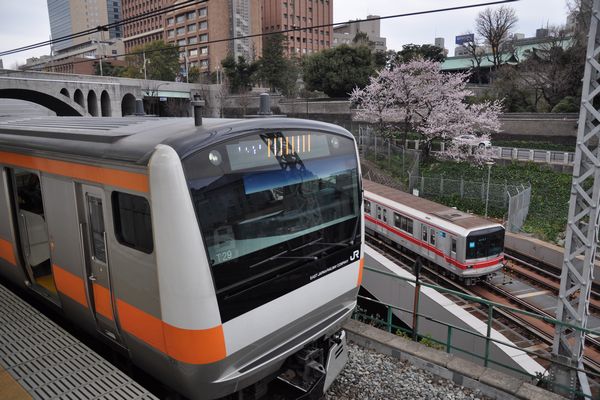 中央線飯田橋-市ヶ谷間です。中央線に乗ったことがある人ならば、おそらく記憶にあると思われる風景です。この区間は地下に有楽町線と南北線も走っています。しかし、電車を利用するなら風景が楽しめて運賃も安いJR(130円。地下鉄は160円)の方が絶対お勧めです。
