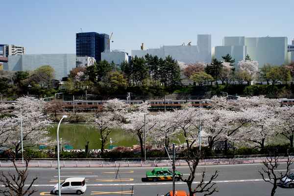 飯田橋-市ヶ谷間の中央線(急行線と緩行線)を外堀通り側から見た風景です。堀の手前に緑色のパラソルが見えますが、これがカナルカフェです。外堀の対岸のビル群(向かって左端が旧東京警察病院)は一面シートで覆われ解体が始まりました。ここに40階建てと30階建ての高層ビル2棟が建設されます。