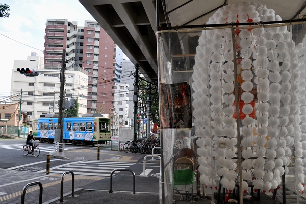 鵬輦の万灯、昼間の姿です。背後は都電7008。
