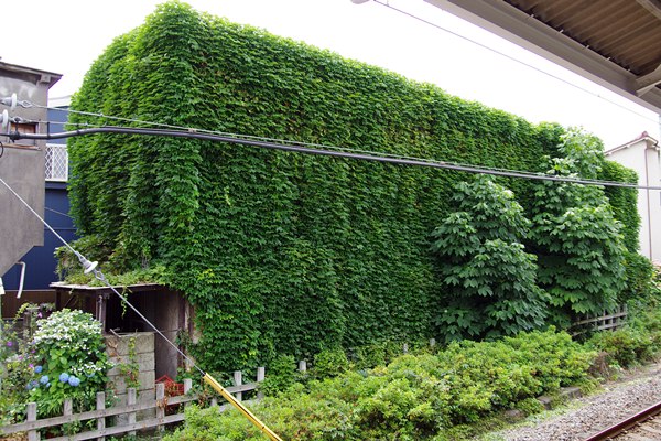 東武東上線・中板橋駅沿いにある廃屋です。木造アパートだったらしいですが、入口部分を残してツタなどの植物に覆い尽くされています。