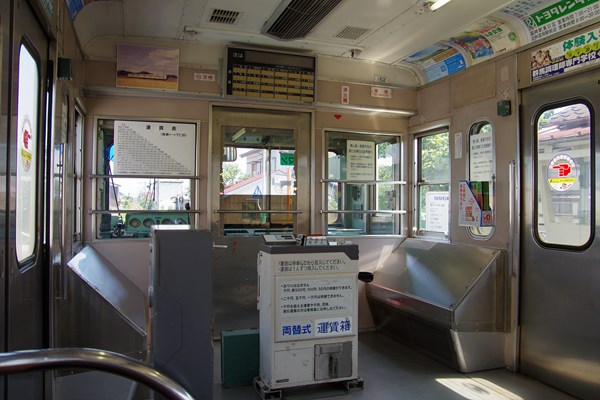 そのクモハ152の車内。ワンマン+無人駅対応のため運転台後の座席は封鎖され、西武時代の面影はありません。