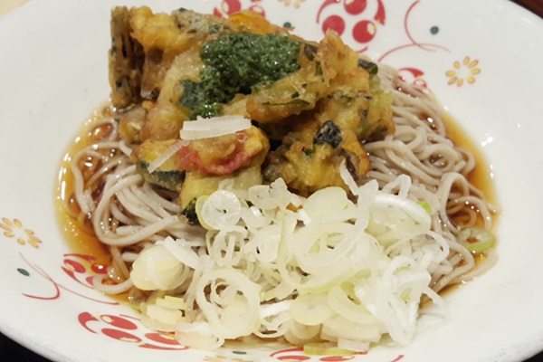 府中本町駅・いろり庵きらく「バジル香る夏野菜の冷やしかき揚げそば」500円(Suica割り480円)です。