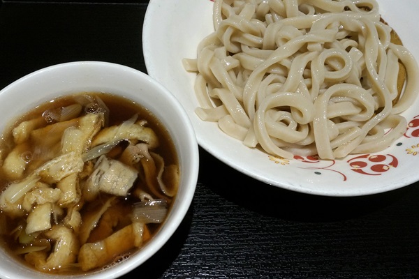 三鷹駅の「いろり庵きらく」の店舗には、店名に「武蔵野うどん」が付加されています。正式な店名ではないでしょうが、ご当地B級グルメ「武蔵野うどん」のメニューがあります。これは肉ねぎ汁うどん580円。