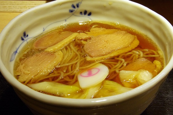 赤羽駅ecute そばいち の鴨そば(500円)です。鳴門はお店のマークの丸一です。