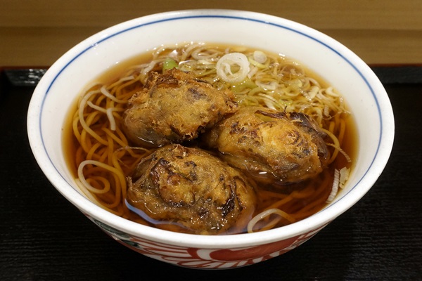府中本町駅、いろり庵きらく「蛸とじゃが芋のかき揚げそば」500円です。