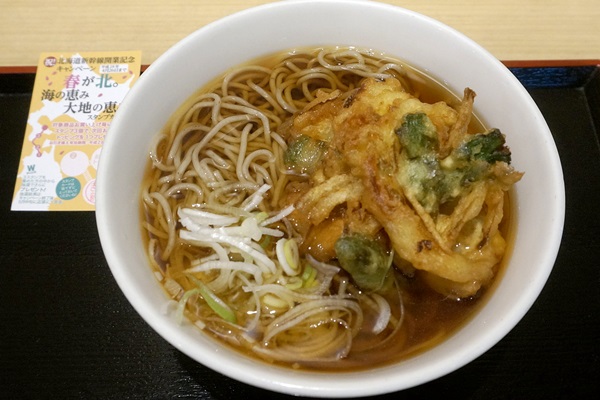 府中本町駅・いろり庵きらく「いかとアスパラのかき揚げそば」520円です。北海道新幹線開業記念ということで、北海道産の食材を使っています。
