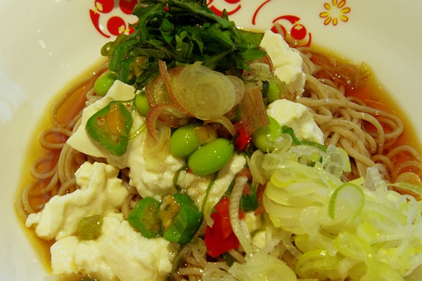 逗子駅・いろり庵きらく「くずし豆腐と夏野菜の冷やしそば」470円です。