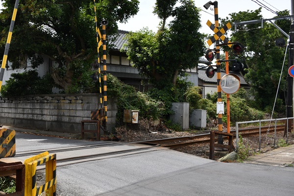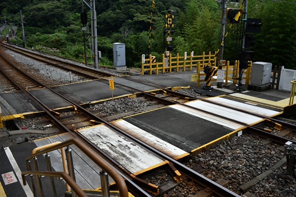 手前が「伊豆大川構内踏切」で、奥が「高原5号踏切」です。隣接していますが、目的が異なる踏切です。