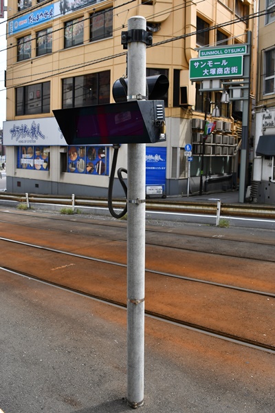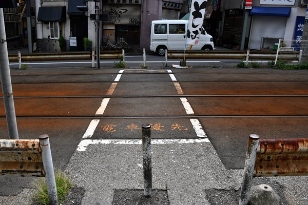 都電荒川線 大塚-向原間にある、遮断機・警報灯のない踏切です。「電車優先」と書かれています。