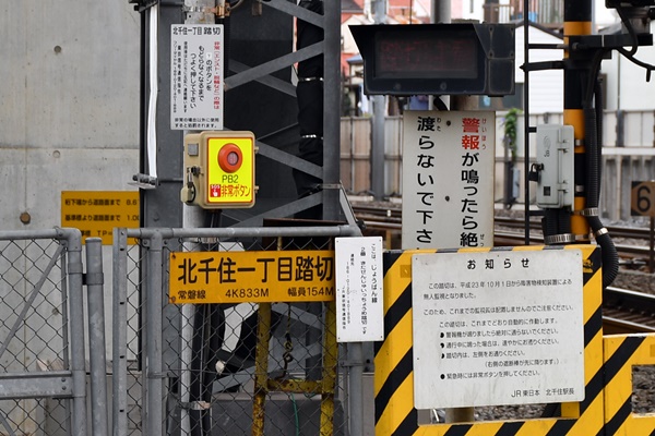 「ここは、じょうばん線 2番 きたせんじゅいっちょうめ踏切です」というひらがな表記もあります。外国人向けでしょうか。