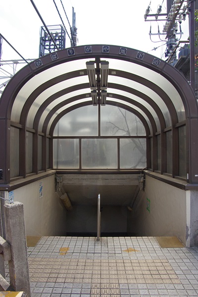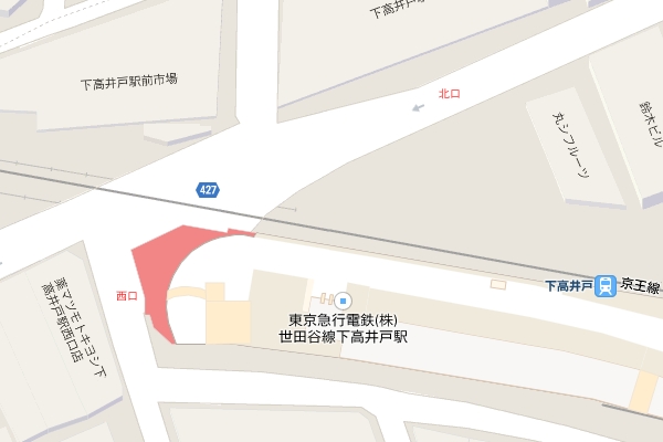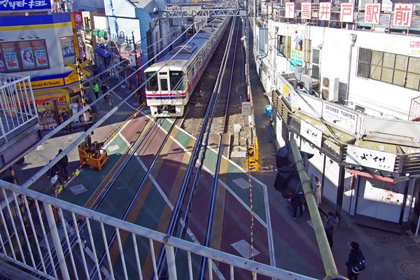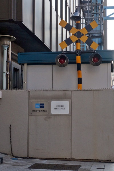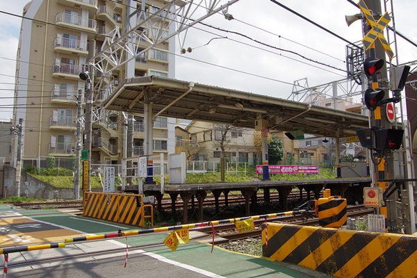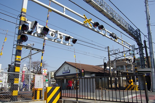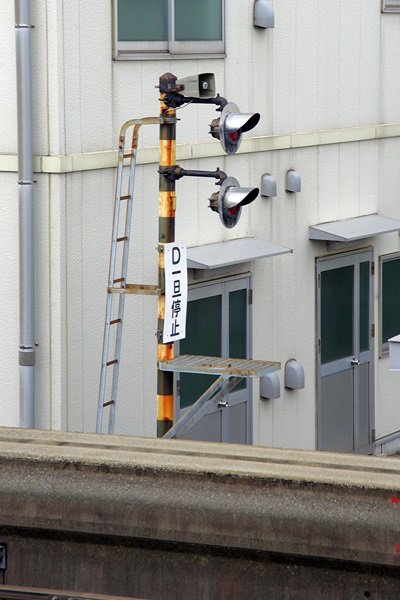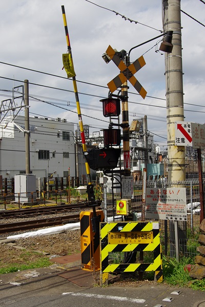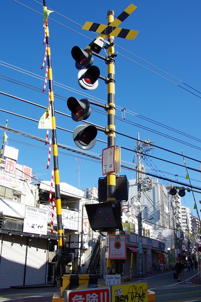 ここは商店街で人通りが多く、さらに狭いため警報灯の設置にもかなり無理があります。上り線新宿方の警報灯は直交した2灯が合体しています。