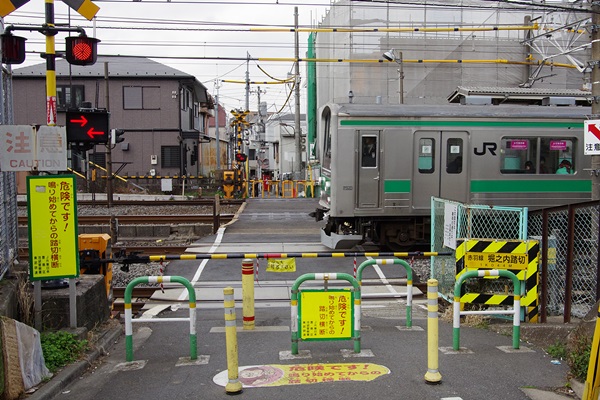 この踏切はちょっと変わっていて、赤羽線 堀之内踏切は「こっち」だけで、「あっち」は違うと言うこと。「あっち」は、昨日掲載した、東武東上線 東第2踏切なんですね。会社が違うので、事故った場合の連絡先も違います。でも、安心してください。踏切の機能としては連動していて、東上線の電車が通過しても、JRの踏切はちゃんと作動します。
