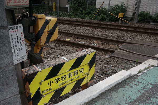 都電荒川線早稲田15号踏切です。 以前も掲載したように早稲田14号踏切が隣接するので、手前側の警報機1本が省略され、遮断機のみになっています。一応、反対側の警報機にこちら向きの赤色灯は付いています。