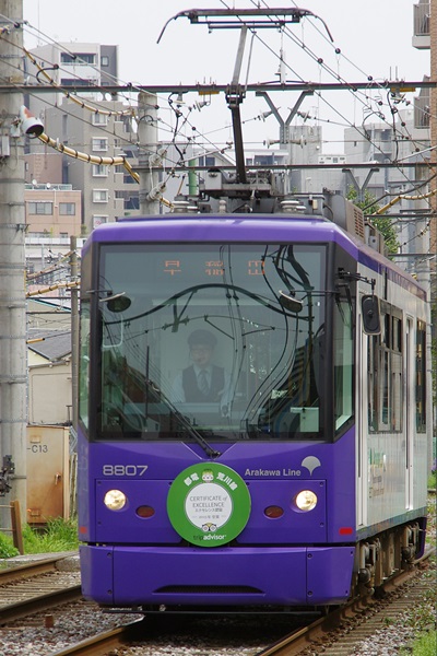 トリップアドバイザーのエクセレンス認証2015受賞ヘッドマークをつけた都電8807です。