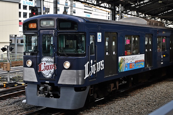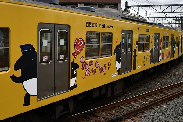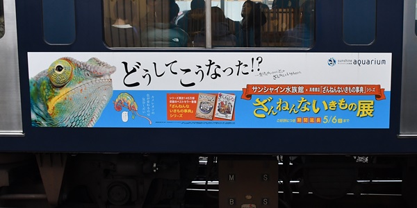 西武9000系(9108F)のライオンズトレインを利用した「サンシャイン水族館ざんねんないきもの展」ラッピング広告車です。もとのラッピングと無関係なラッピングを出す数少ない手法。