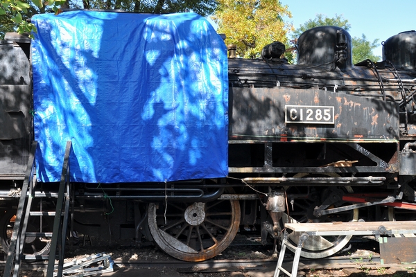 キャブはシートを掛けて修復中、水タンクの裾はカバーが外されています。
