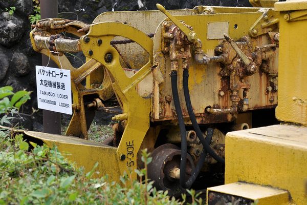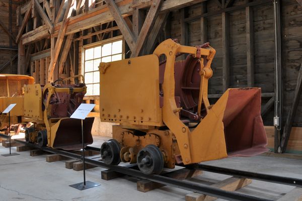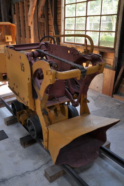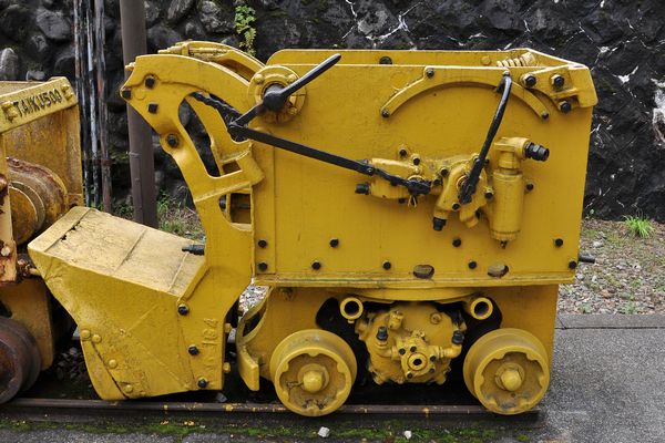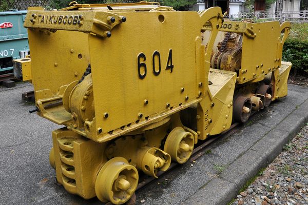 足尾銅山の坑内軌道で使用されていた太空機械製600B型バケットローダーです。採掘した鉱石を先端のバケットですくい上げ、後ろの鉱車に載せます。
