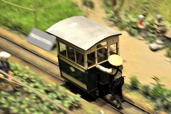 こちらは葛飾柴又寅さん記念館に展示されている模型です。車夫付き人車レイアウトは全国唯一だと思われますが、結構速いです。この模型は「帝釈人車鉄道(金町-柴又間1.5km)」の人車を再現したもので、同鉄道は現在、京成金町線になっています。鉄道博物館の保存車とは窓の数が違うだけで全体として酷似しています。