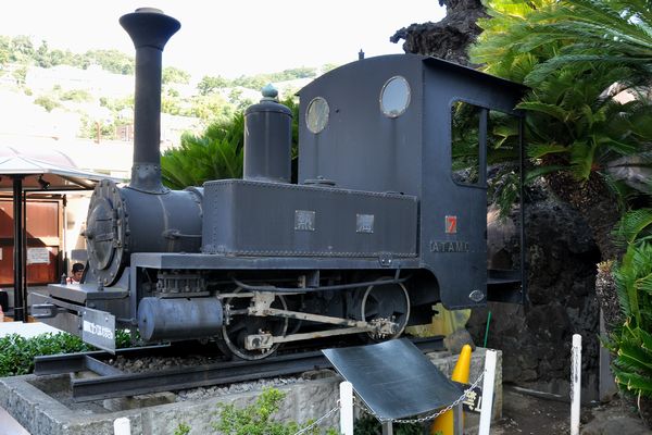 旧熱海鉄道(熱海-小田原間25km, 軌間762mmの軽便鉄道)で1907年に使用開始となったB形タンク機です。小さなボイラー、長い煙突と蒸気ドーム、そしてキャブ。25kmを2時間40分もかけて走っていた姿を想像すると、何ともユーモラスです。準鉄道記念物に指定され熱海駅前で保存されています。
