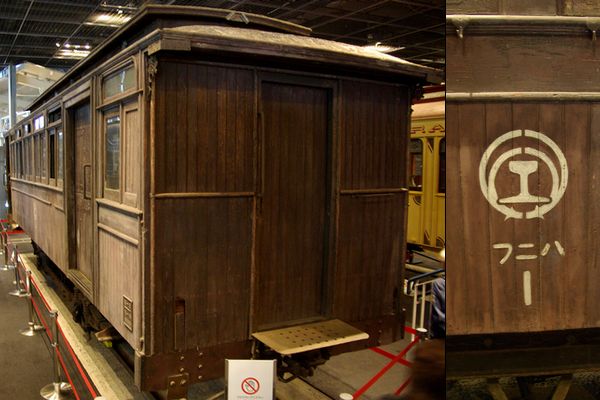 ただものではない風貌の木造客車ハニフ1。この車両は最終的に松本電気鉄道で使用されましたが、もとは甲武鉄道デ968という2軸電車でした。甲武鉄道は日本初の電気鉄道(1904年飯田町-中野)であり、この車両はその当時東京を電気で走っていたわけです。現在は鉄道博物館に保存されています。