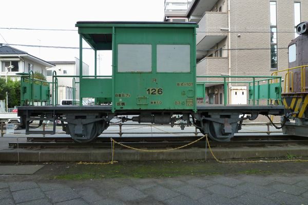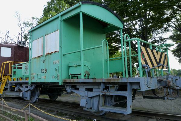ED5020と連結されて保存されているヨ101形ヨ126。こちらの窓ガラスも同様。国鉄の車掌車とは違って、デッキが異常に広くなっています。