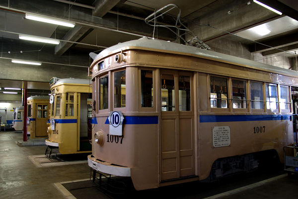 横浜市電保存館は、市営バス滝頭営業所に隣接する市営住宅の1階部分にあります。本物の車庫のような雰囲気の中で、往年の市電が整然と並んでいます。