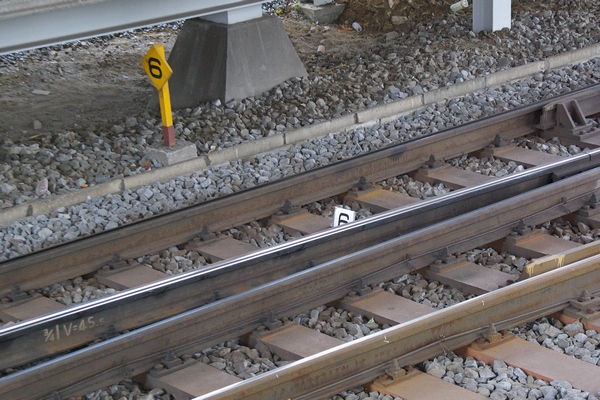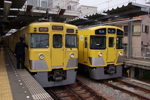 西武2000系(左,クモハ2413)と新2000系(右,クモハ2517)の並びです。ところで、よく見るとレールの数が変でしょう?