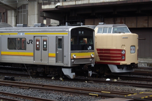スカートの一部が取り外されて留置されているクハ205-88です。隣は田町のH101編成クハ189-513、前幕が「特急」表記になっています。