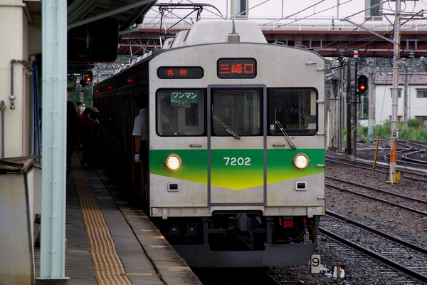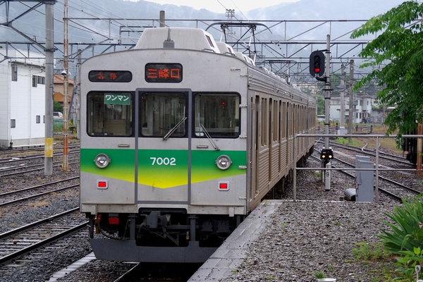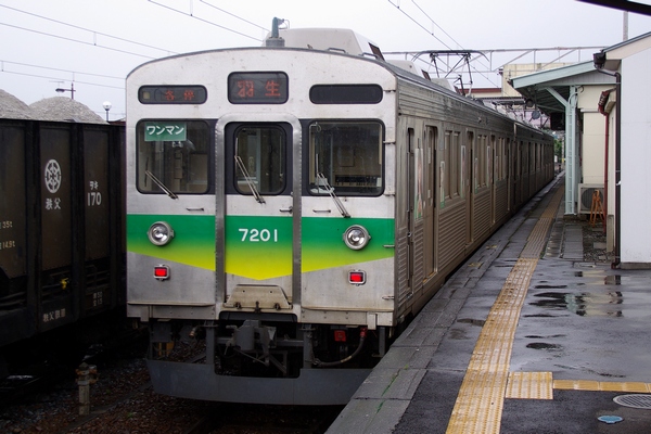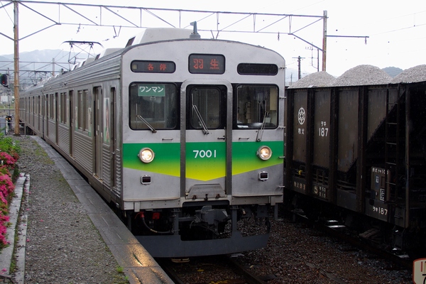第1編成の先頭車デハ7001です。石灰石運搬列車を追い抜きます。
