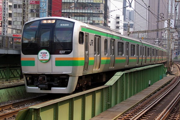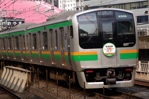 東海道線全通(新橋-神戸)全通120周年のヘッドマークを付けたF-03編成クハE217-3です。