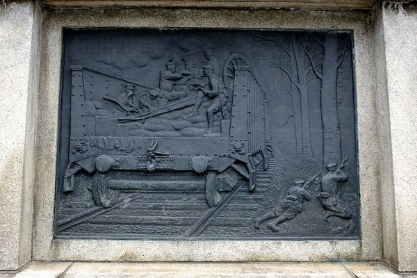 第1次世界大戦中シベリアで使用されたらしい旧日本軍の装甲列車が描かれたレリーフです。丈夫な無蓋車に普通の大砲を乗せただけに見えますが...。連結器がねじ式なので緩衝器が付いています。