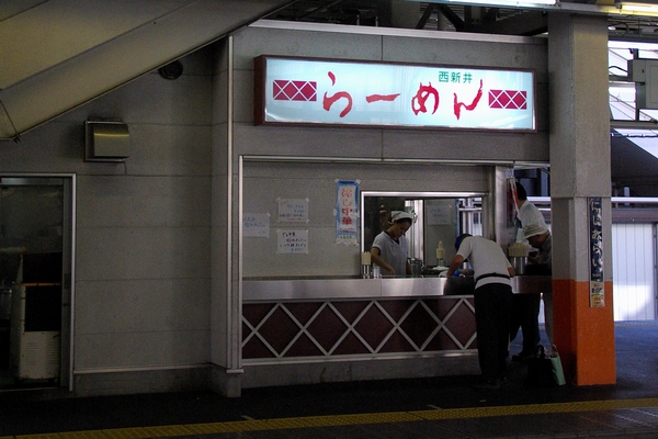 西新井駅下りホーム「西新井らーめん」。ホーム上で食べるタイプ。