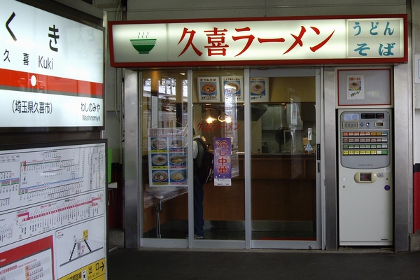 久喜駅上りホーム「久喜ラーメン」(閉店)。久喜だけはドアで分離されているものの、中は立ち食い。