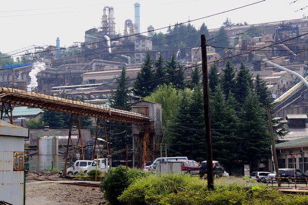 ここが安中です。駅の隣が東邦亜鉛の安中精錬所になっています。画像左下に専用線の線路が見えます。